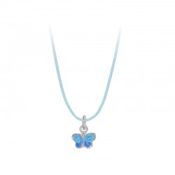 Collier pendentif papillon en argent et décor émail bleu, codon en coton bleu ciel.